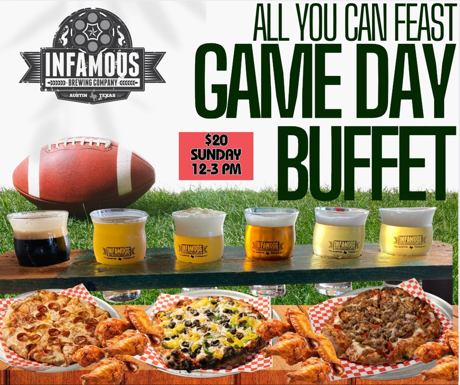 Join us every Sunday at Infamous Brewing for all the NFL games. Come early for kickoff, and enjoy all you can eat pizza and wings until the first games end for just $20! Catch every game, on every tv with fresh cold beer brewed right here!